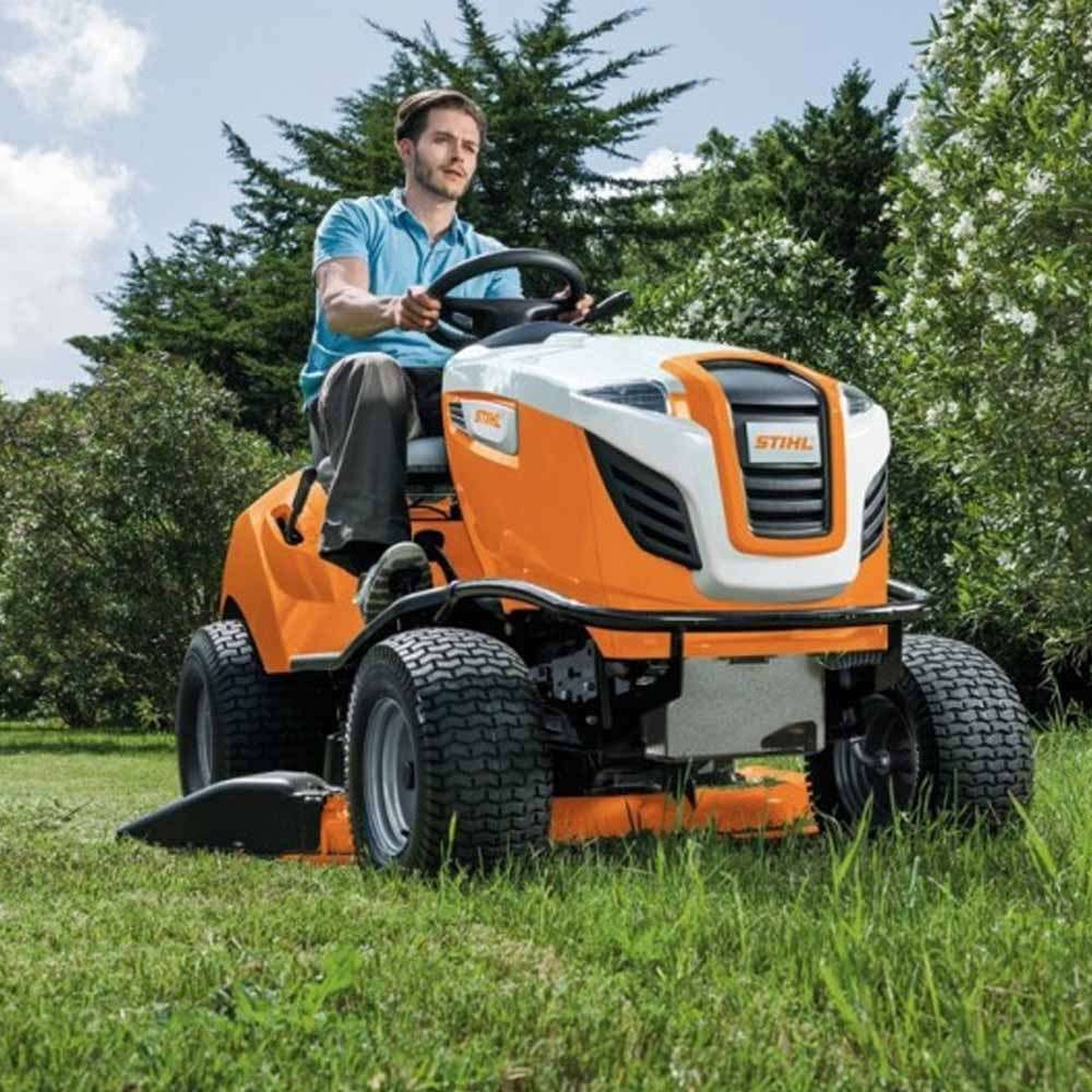 Trattorino da giardino con scarico laterale ed elevato comfort di comando e di guida. Per la cura di superfici erbose molto ampie. Trazione a 1 pedale specifica di STIHL. Potenza 8,9/12,1 kW/CV. Motore STIHL EVC 4000.